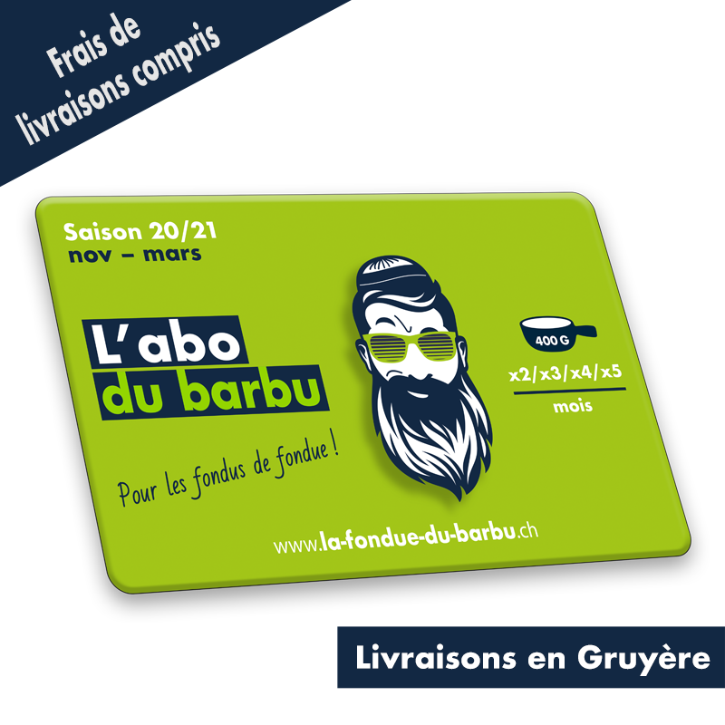 1 Fondue du Barbu® (1x400gr) livrées directement à ton domicile une fois par mois de novembre 2020 à mars 2021. Tes fondues te seront livrées en Gruyère tous les 1er jeudis du mois entre 17h et 20h par le Barbu en personne ;-)Commande et reçois ton Abo personnalisé ! ...pour les livraisons dans la Suisse entière, voir l'Abo qui y correspond